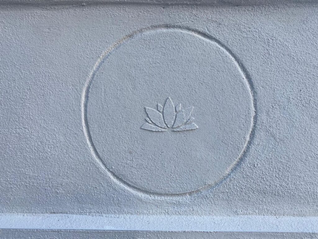 Orientamos los cuatro lados de la Estupa hacia los puntos cardinales, con símbolos de los cinco Budas representados en relieve sobre el mortero blanco: